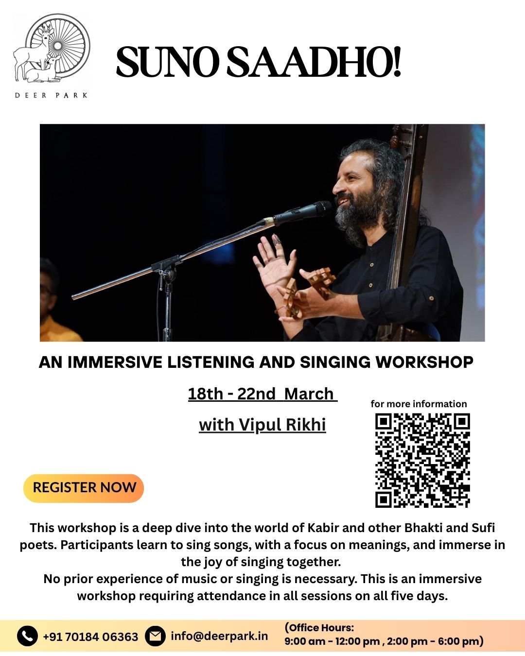 Deer Park Institute, BirThe next Suno Saadho workshop at Deer Park Institute in Bir, Himachal Pradesh, will take place from 18-22 March. This workshop is a deep dive into the world of Kabir and other Bhakti and Sufi poets. Participants learn to sing songs, with a focus on meanings, and immerse in the joy of singing together. No […]